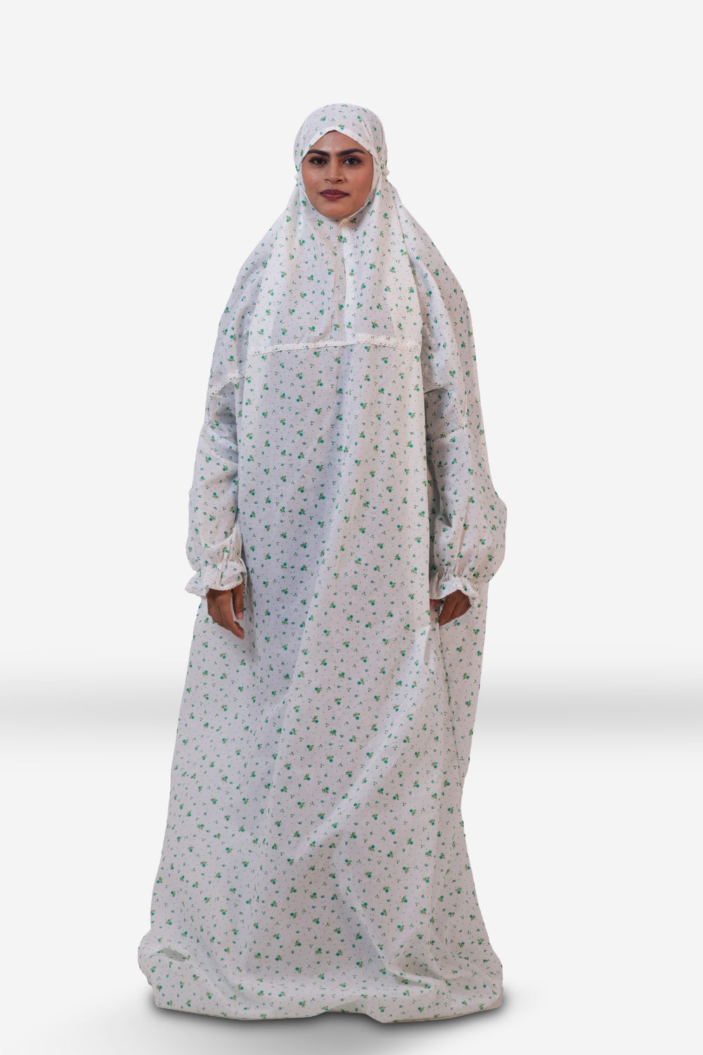 Mina Tara (The Star): A playful, dainty-printed cotton prayer outfit with repetitive micro-motifs. This durable cotton material is easy to wash and ideal for heavy daily use.